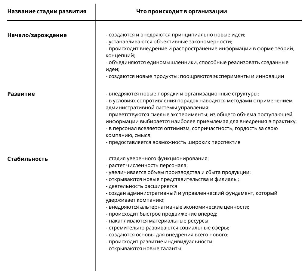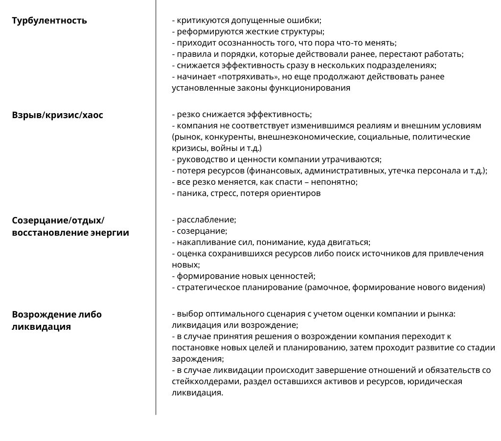 В таблице представлены семь стадий развития организации. На каждой стадии потенциально могут возникать различные противоречия и по-разному разрешаться и влиять на организацию. К примеру, на стадии турбулентности критичный пересмотр процессов, отношений, поведения сотрудников и руководства, а также принятие соответствующих мер приводит к тому, что взгляд на происходящее становится более ясным, уровень противоречивости и конфликтности здесь может быть достаточно высоким, но как показывает практика, это идет во благо. Именно принятие существующих проблем помогает в поиске решений, поскольку отрицание существующих проблем или нежелание руководства на них смотреть всегда ведет к усугублению.