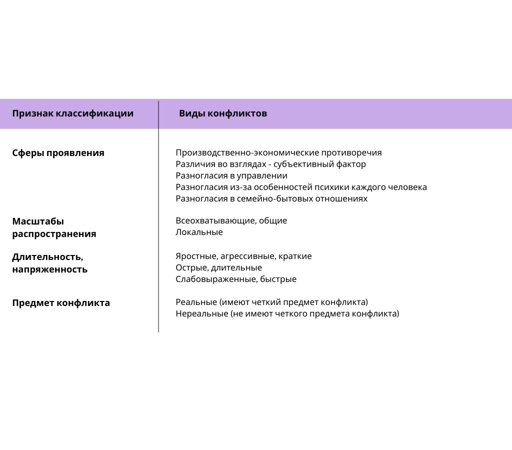На практике конфликты, возникающие в организациях, можно классифицировать по признакам: сфера проявления; масштаб распространения; длительность и напряженность; предмет. Данная классификация представлена в таблице ниже. Эту информацию также можно учитывать при анализе конфликта и степени влияния конфликта на организацию или достижение цели.