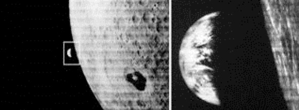Подпись к изображениям Земли: «Илл.2. Виды далёкой Земли, снятые «автоматами» до и во время полётов «Аполлонов»: а,б) американскими ИСЗ АТС-1 и АТС-3 (декабрь 1966 и январь 1968) в,г) советскими автоматическими кораблями «Зонд-5» и «Зонд-7» (сентябрь 1968 г и август 1969 г)». [2] Аноним утверждает: «По этой методике изображения сначала фотографируются. Затем фотопленка проявляется и просматривается, считывается с помощью фотоэлемента. И уже сигналы с фотоэлемента через антенну «Орбитера» «не спеша» передаются на Землю. Качество принимаемого изображения получается гораздо лучшим, чем при прямой телепередаче, но вся процедура требует много времени. В результате, если «Рейнджер» (прямое ТВ) успевал за 20 минут падения передать несколько сот изображений, то «Орбитерам» для передачи примерно такого же количества изображений требовалось около двух недель. На многих снимках, полученных от «Орбитеров», заметны продольные полосы (илл. 8). Это следы работы считывающего устройства.