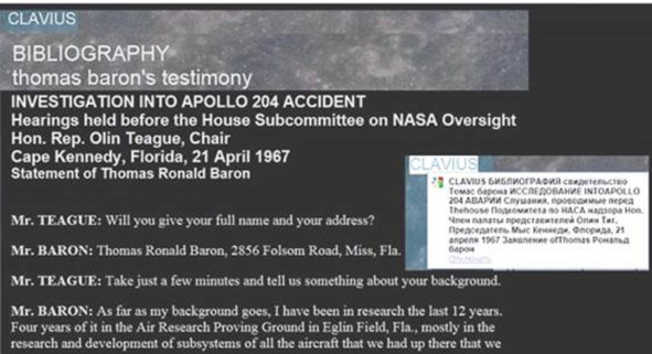 Далее читаем там же: «Бэрон написал два доклада. Первый 55 страничный доклад был представлен чиновникам НАСА в конце 1966 года, вскрывая нарушения, которые он наблюдал во время работы на космодроме. Менеджеры изготовителя решили, что некоторые замечания Бэрона правильны, но в остальном доклад неприемлем. После утечки доклада в прессу, он был уволен. Бэрон начал готовить основательный доклад. После пожара «Аполлона 1» он представил этот доклад на 500 страниц в комитеты Конгресса, расследовавшие этот инцидент». Итак, в конце 1966 года инспектору был послан вполне ясный сигнал «За критику «Аполлона» Вы уволены! Делайте выводы!». Вряд ли он знал, что вместо полётов на Луну готовится глобальный обман. Скорее всего, Бэрон искренне беспокоился за астронавтов, которые сядут в такой корабль. А по сути дела, он тоже «вешал лимон» на «Аполлон». 21 апреля 1967 года, вооружившись вторым докладом, он вновь вызвал руководство НАСА на явно неравный спор об «Аполлоне». [4] Автор книги показывает наличие документов, ссылаясь на американского пропагандиста «Джея Виндли». Указанный инспектор имел отношение к программе «Аполлон»: «За своё правдоискательство инспектор Бэрон уже получил увольнение с работы. Ближе к развязке этой истории Т. Бэрон и его жена стали получать новые предупреждения. Уже анонимно и по телефону. «Томас Рональд Бэрон заявил перед Конгрессом, что плачевное состояние аппарата не позволило бы достичь Луны. Он представил отчёт на 500 листах. Высказав своё мнение, Бэрон превратился в живую мишень. Корреспондент: «Вы чувствуете давление со стороны НАСА?». Бэрон: «Нет! Хотя сразу после этого инцидента, мы с женой получали звонки с угрозами, но сейчас всё тихо». Бэрон успокоился, а зря.». [4] Ниже представлено изображение документа.