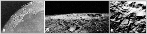 Илл.7. Снимки «Орбитеров»: а) вид части лунного шара, б) кратер Коперник с диаметром около 100 км, в) небольшой участок местности в районе кратера Тихо.