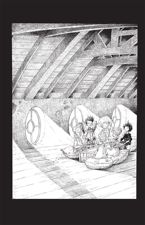 Ада вскарабкалась по лестнице, за ней последовали Уильям и Руби. Перешагнув через люк, она огляделась по сторонам и увидела, что находится в просторном помещении с косым потолком, поддерживаемым сотней опор и балок. С одной стороны, у самого пола, виднелся ряд круглых окошек, сквозь которые луна бросала свет на пыльные половицы. В центре чердака стояли фруктовые ящики, приспособленные в качестве стола. Их окружали старые угольные мешки, набитые фасолью (несколько фасолин просыпалось на пол). На мешках сидели два мальчика чуть постарше Уильяма. Завидев Аду, они вскочили.