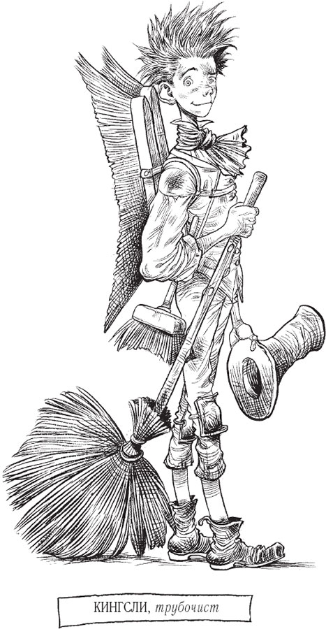 Кингсли-трубочист, напротив, был худым дылдой с черными и жесткими, как щетка, волосами. За спиной у него тоже были прикреплены две большие щетки, похожие на подкопченные крылышки.