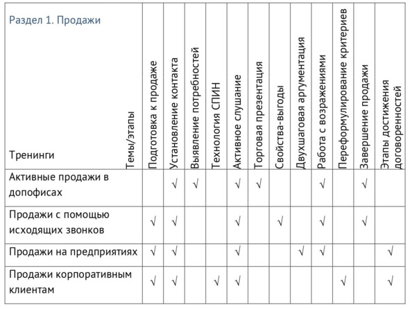 Раз в качестве примера мы выбрали продажи, то у нас тут есть и подготовка, и контакт, и выяснение потребностей и пр. Подчеркну, что все это мы берем из реально проводимых тренингов.