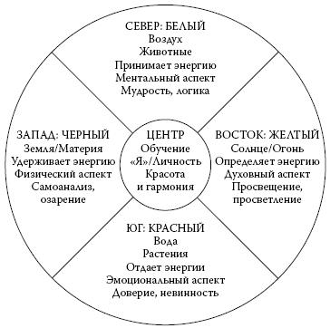 Указанные четыре направления представляют четыре стадии жизни: рождение (восток, огонь, новое начало), юность (юг, вода, эмоциональная спонтанность и доверие), зрелость (запад, земля, физическая энергия) и старость (север, воздух, мудрость). В этом смысле «шаманское колесо», которое часто называют «колесом жизни», предстает как некая магическая матрица или сакральный «обруч», опоясывающий и скрепляющий жизнь человека. Учтите, что это лишь один из методов подхода к «колесу жизни», которое в различных шаманских традициях может рассматриваться совершенно иначе.