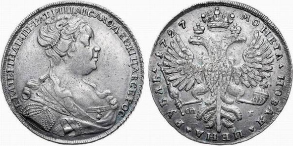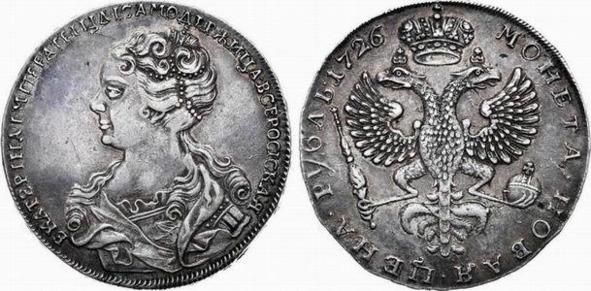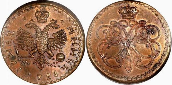 В 1726 Меншиков выпустил монеты со вензелем Е и М Екатерина и Меньшиков, сюда же включен дополнительный элемент греческая буква «гамма», не имеющая никакой видимой связи с другими литерами и нарушающая все каноны монетной чеканки. Она несет огромную смысловую нагрузку. Вместе с нижними частями двух литер «I» она образует букву «М», которая по начертанию в точности соответствует той, что помещена на решетках балюстрады дворца Меншикова на Васильевском острове в Санкт-Петербурге.