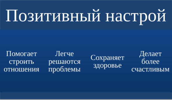 Это не значит, что у позитивно настроенных людей все будет гладко в этой жизни. Однако позитивный настрой помогает проходить трудные ситуации, возрождаться к новым свершениям, когда, кажется, что всё потеряно, сохранять чувство счастья внутри себя.