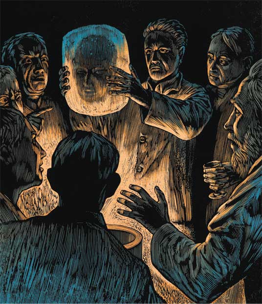Снова взволнованный гомон. Магистр отодвинулся, и Лире стал виден ящик. В луче проекционного фонаря старик Проректор держал перед своими глазами тяжелый ледяной куб, и Лира разглядела предмет внутри: окровавленный кусок, в котором трудно было узнать человеческую голову. Пантелеймон порхал вокруг, его отчаяние передавалось Лире.