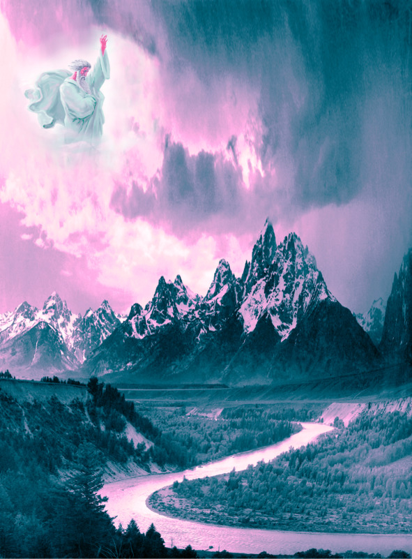 Обида Бога. Фото пейзажа Ансела Адамса (19021984), великий американский фотограф, классик пейзажной фотографии. Его фотография «Хребет Титон и река Снейк» вошла в серию снимков, занесенных на золотую пластинку космического корабля «Вояджер», чтобы стать частью послания внеземным цивилизациям. Изображение Бога повторяет рисунок из Библии Густава Доре. Цитата Тома Энга.