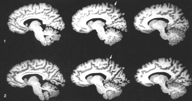 MRI-скан мозга однояйцевых близнецов. Между P и стрелкой у ребенка в верхнем ряду 3 мозговые извилины, а у ребенка в нижнем ряду 4 (Steinmetz H., Herzog A., Huang Y., Hacklander T. Discordant Brain-Surface Anatomy in Monozygotic Twins // The New England Journal of Medicine. 1994. 331. P. 951952). Паттерн мозговых извилин и борозд формируется главным образом в течение трех последних месяцев беременности. Таким образом, причина этих негенетических различий должна возникать именно в этот период.