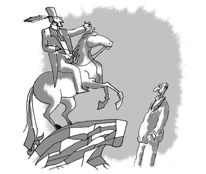 Когда они подошли поближе, их взгляду предстала конная скульптура с сидящим на ней верхом великим поэтом. Левой рукой он сжимал поводья, а правой касался уха, за которое было заложено длинное гусиное перо, напоминающее по размеру уже павлинье. Без сомнений, это был Александр Сергеевич: профиль, бакенбарды, курчавая шевелюра спутать его с Лермонтовым было невозможно.