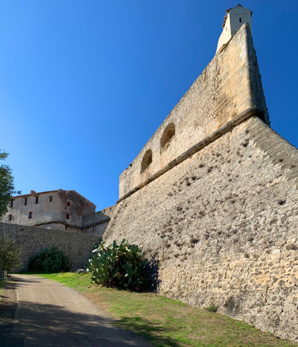Мы стоим на стене форта Карре. Форт на границе Антиба, дорога к нему идет вдоль бухты со знаменитым портом Вобан. Форт красавец. Особенно впечатляют спутниковые фотографии величественная звезда с четырьмя лучами-бастионами. XVI-й век. Раньше форт служил для охраны границы между Королевством Франции и итальянским графством Ницца. Антиб был последним французским портом перед этой границей.