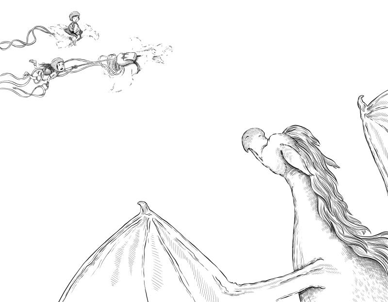 Мисс Келли расправила свои огромные крылья и взмыла в небо. Судя по всему, драконы-хамелеоны были ей не в диковинку, потому что она устремилась прямо к Грауну и Фафнин. Для такого пожилого дракона мисс Келли оказалась на удивление легка на крыло.