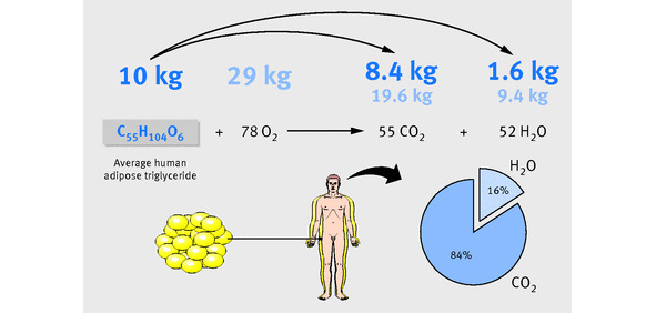 А правильный ответ заключается в том, что большая часть жира выделяется в виде углекислого газа. Если коротко, то жир вступает в реакцию с кислородом, и на выходе получаем углекислый газ и воду. Учёные говорят, для потери 10 кг жира потребуется 29 кг кислорода для вдыхания. В результате метаболического процесса образуется 28 кг углекислого газа и 11 кг воды. То есть из 10 кг жира мы выдыхаем около 8,4 кг в виде углекислого газа и 1,6 кг превращается в воду, которая выходит с мочой, калом, потом, дыханием, слезами и другими жидкостями организма. Только представьте, жир выплакали.