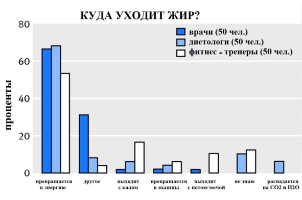 Был даже проведён опрос 50 докторов, 50 диетологов и 50 фитнес-тренеров, и более 50% всех из них считали, что жир превращается в энергию39.
