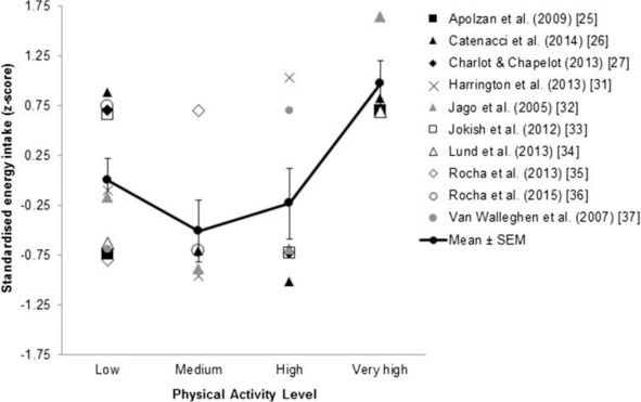 А вот учёные провели систематический обзор 28 исследований с целью изучить, различается ли контроль аппетита в зависимости от уровня физической активности, обладают ли физически активные люди более чувствительным контролем над аппетитом, чем их неактивные коллеги26. Получился интересный график: