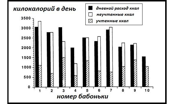 При очень высокой активности люди, естественно, ели больше всего. Но при самой низкой активности они ели больше, чем испытуемые с умеренной активностью. Другими словами, при умеренной трате энергии люди потребляли достаточно калорий для своих затрат, а при низкой слишком много. Поэтому с ростом активности аппетит наоборот снижается, увеличиваясь лишь при очень высокой активности, но это уже мало на что влияет. Именно поэтому, когда люди считают, что совсем ничего не едят, а двигаются, как гориллы в период спаривания, скорее всего, они просто не видели, как спариваются гориллы, и их активности всё ещё недостаточно, чтобы покрыть те «крошки хлеба», что они клюют.