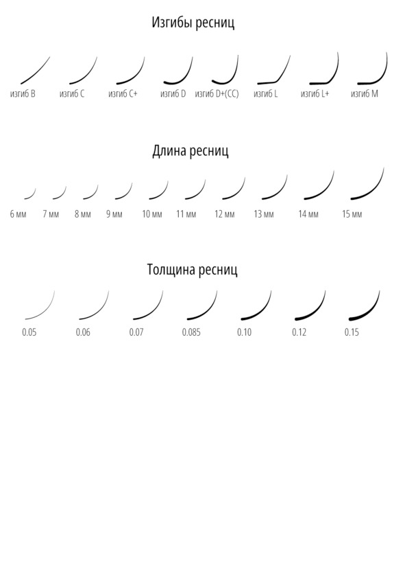 Ресницы бывают различной длины, толщины, и имеют разный изгиб. На сегодняшний день на рынке представлен огромный выбор различных ресниц для работы, однако, не стоит забывать, что качество материала напрямую влияет и на результат работы. Не стоит экономить при выборе данного продукта