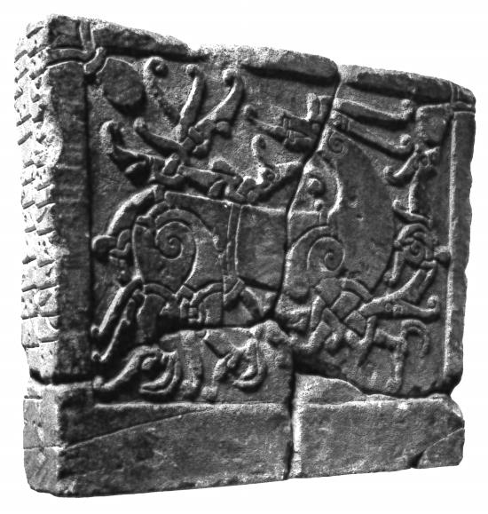 На могильной плите IX в. (т. н. «квадратная могила»), под которой покоился прах викинга, изображены побеги растений, оплетающих тело обернувшегося в беге зверя. Эта могильная плита была обнаружена в 1852 г. на кладбище церкви Святого Павла в Лондоне. Следы краски на камне позволяют утверждать, что тело животного было черно-синим с белыми отметинами, а фон светло-желтым. Руны, высеченные в левом углу, гласят: «Сей камень воздвигли Гинна и Токи».
