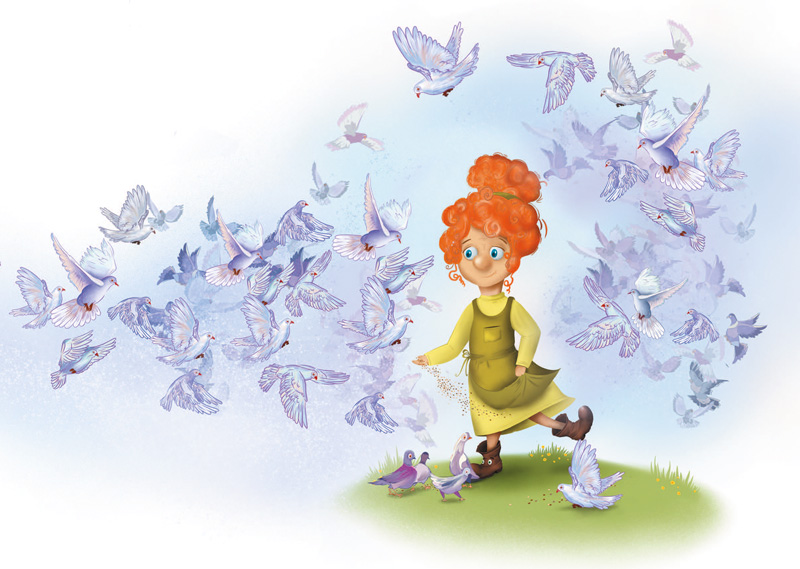 Голуби опускались пушистым облаком на землю и, воркуя от удовольствия, принимались клевать зерно. Отряхивая голубиные пёрышки со своих кудрявых огненных волос и улыбаясь, маленькая, старушка стояла в середине птичьего кольца и подкидывала своим подопечным новые порции.