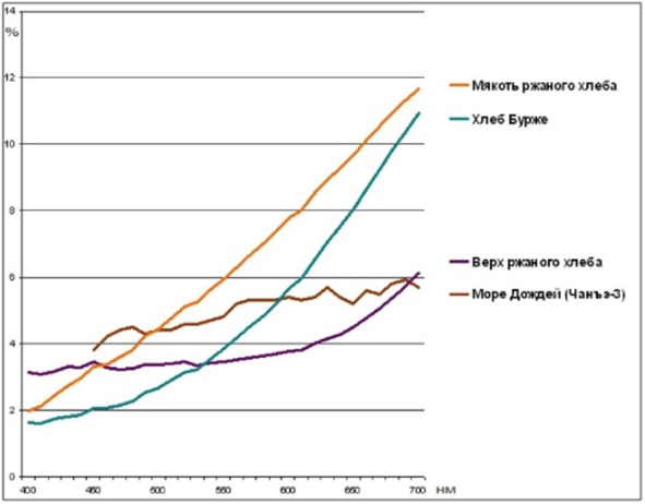 Рис.70. Сравнение спектральных кривых отражения ржаного хлеба и лунного грунта из Моря Дождей. [6] Леонид Коновалов делает следующий вывод: «Итак. С помощью объективной характеристики цвета спектральной кривой отражения лунного грунта мы подобрали объекты, которые визуально похожи на цвет лунного реголита, а затем цвет различных участков Луны (Моря Изобилия, Моря Спокойствия, Океана Бурь) воспроизвели на экране компьютера в виде цветных квадратиков, с соблюдением всех условий психологически правильной цветопередачи. Таким образом, мы показали, каким по цвету должен получаться лунный грунт на фотоплёнках Эктахром: все участки должны быть тёмно-коричневыми. Цветная обращаемая фотоплёнка Эктахром была использована, согласно легенде, во время пребывания американских астронавтов на Луне. То, что цвет лунного грунта на подавляющем большинстве американских снимков в миссиях Аполлон (196972 гг.) выглядит совершенно серым (при наличии цветных объектов в кадре), свидетельствует о том, что эти снимки были сделаны не на Луне. В статье разъясняется причина, почему на основе первых снимков лунной поверхности с близкого расстояния, полученных с помощью автоматических станций Сервейер в 196667 гг., был сделан неправильный вывод о цвете поверхности Луны. Причиной явилось неправильное цветоделение из-за неверной триады цветных фильтров. Именно из-за неправильно подобранной триады фильтров цвет реголита потерял насыщенность и стал почти серым. Это повлекло за собой ошибочное решение о том, что делать песок в павильоне, для имитации лунной поверхности, следует серо-пепельным». [6] Программу «Сервейер» можно считать мифической только на том основании, что аппарат с этим названием участвовал в «Лунном» шоу США. Китайская «Луна», которая становится то красно коричневой, то серой, вероятно, представляет часть китайского обмана и фальсификации своего «достижения».