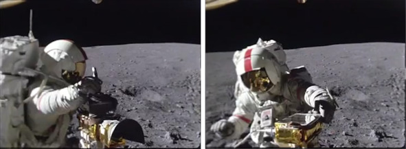 Леониду Коновалову следовало посмотреть другие фильмы НАСА из этого же шоу, где присутствует и шарканье ног и выброс пыли при ходьбе в стороны. Но что касается этого ролика то здесь можно поспорить об использовании больших кукол вместо живых актеров. По поводу частоты фольги на телекамере, можно возразить, что просто издалека не видна мелкая пыль или частички грунта. А клоун НАСА, живой актер это увидел и попытался убрать указанные фрагменты почвы. Конечно, в таких перчатках и в таком костюме это было сделать сложно. Если еще за спиной находятся тонкие карбоновые лонжи, невидимые для глаза, то такая задача становится очень сложной. В таком снаряжении человек может принимать неестественные позы, растопыривать руки, ноги, такое тоже можно допустить. Одно дело проводить съемку неподвижной куклы в лунной телеге НАСА с радиоуправлением. И совсем другое дело снимать две куклы в движении. Здесь нужна или кукольная мультипликация, удовольствие дорогое и огрехи движения кукол там очень заметны. Или вариант марионетки, которая управляется с помощью подвесов кукловодом сверху. Это тоже та еще морока.