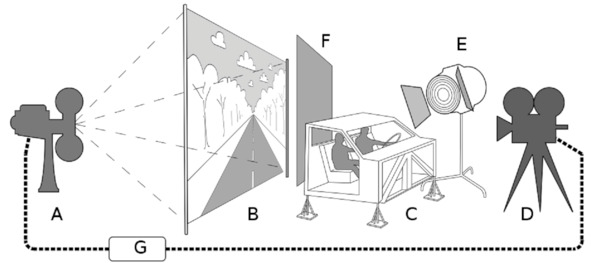 Описание метода съемки, при котором около неподвижного макета автомобиля можно снимать актеров, а потом движение самой машины: «Скорая рирпроекция много использовалась в первые десятилетия звукового кино из-за громоздкости синхронной съёмочной и звукозаписывающей аппаратуры. Из-за особенностей технологии синхронной записи актёрской фонограммы съёмка многих сцен была возможна только в студии. Потому большинство сцен с актёрами, едущими в автомобиле или поезде, летящими в самолёте и плывущими на кораблях, снимались способом рирпроекции. При этом виды из окон снимались заранее, а интерьер салона автомобиля или купе вагона строился в павильоне студии. При съёмке по технологии скорой рирпроекции предварительно отснятый фон проецируется на прозрачный матовый экран B, по другую сторону которого находятся элементы декорации С с актёрами и киносъёмочный аппарат D. При этом кинопроектор A, демонстрирующий изображение на экране, синхронизируется с киносъёмочным аппаратом так, чтобы открытие обтюратора камеры совпадало с открытием обтюратора проектора. Для этого в приводах обоих аппаратов используются синхронные электродвигатели, получающие переменный ток от общего источника G. На экран проецируется зеркально перевёрнутое изображение, которое со стороны камеры выглядит прямым. С целью недопущения засветки фона от осветительных приборов Е, работающих на актёрскую сцену, на границе кадра устанавливаются дополнительные световые ограждения F.