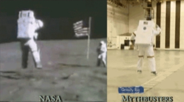 Мы взяли их видео и тут же исправили недочёт «разрушителей» слегка замедлили скорость их прыжка. Смотрите теперь сами можно ли в павильоне сымитировать «лунные прыжки»? Сравнение прыжков НАСА и «разрушителей мифов». Мы взяли их видео и тут же исправили недочёт «разрушителей» слегка замедлили скорость их прыжка. Смотрите теперь сами можно ли в павильоне сымитировать «лунные прыжки»? «Разрушители» подпрыгивают даже выше, чем астронавты якобы на Луне! Почему скептики считают, что NASA использовало трос (лонжи) для съемки прыжка актёра, изображающего астронавта?