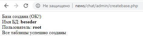 Запускаем сайт. Добавляем после «news» в адресную строку /chat/admin/createbase.php. Обновляем страницу. Должно получиться следующее.