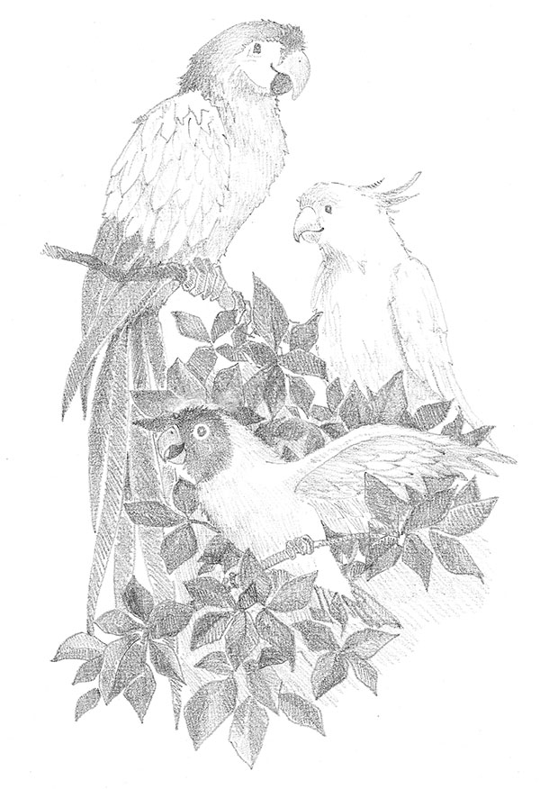 Весёлый попугай-неразлучник расправил крылья и перелетел на ветку поближе к Зоуи. Он закивал розовой головкой, приветствуя девочку. За ним следовал Рио белый какаду с жёлтым хохолком, похожим на экстравагантную причёску.