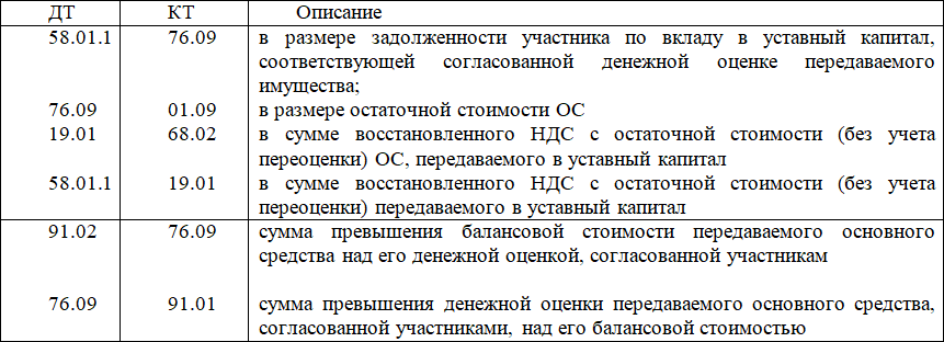 Дт 91.02 Кт 76.09 отражена сумма превышения балансовой стоимости передаваемого основного средства над его денежной оценкой, согласованной участникам.