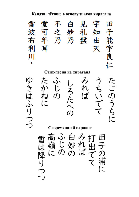 Расшифровка. Когда я вышел к заливу Таго и взглянул вдаль, я увидел вершину горы Фудзи, укрытую, словно белоснежными одеждами, снегом, который всё идёт, падает на вершину.