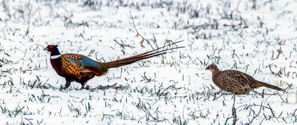 Фазан обыкновенный. Самец (слева) и самка (справа).