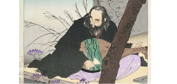 Сэмимару играет на бива («Четыре лунные струны»). Цукиока Ёситоси, ранее 1892 г.