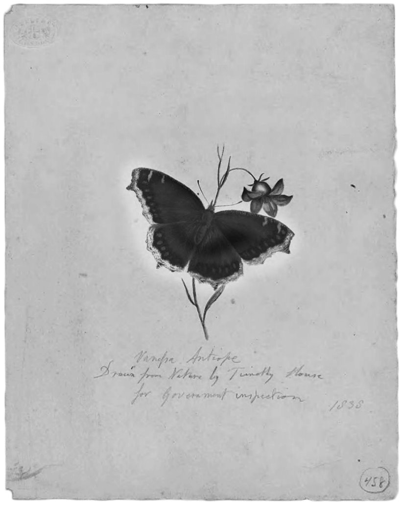 Тимоти Хауз. Бабочка Vanessa antiopa. 1838. Гуашь, бумага
