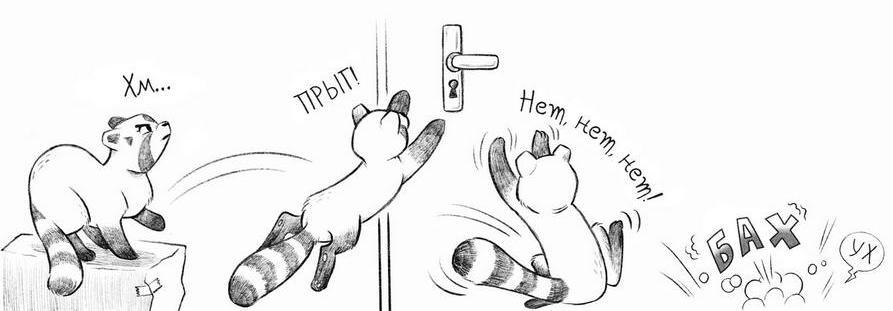 Пододвинув ящик к двери, маленькая панда мягко запрыгнула на него, и уже оттуда снова на дверную ручку.