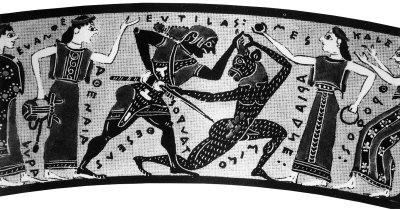 Третий способ идентифицировать миф изобразить героя, сражающегося с уникальным, ни на кого не похожим противником. Подойдет любое диковинное существо, будь то многоголовая гидра, птица с человеческой головой или быкоголовый мужчина.