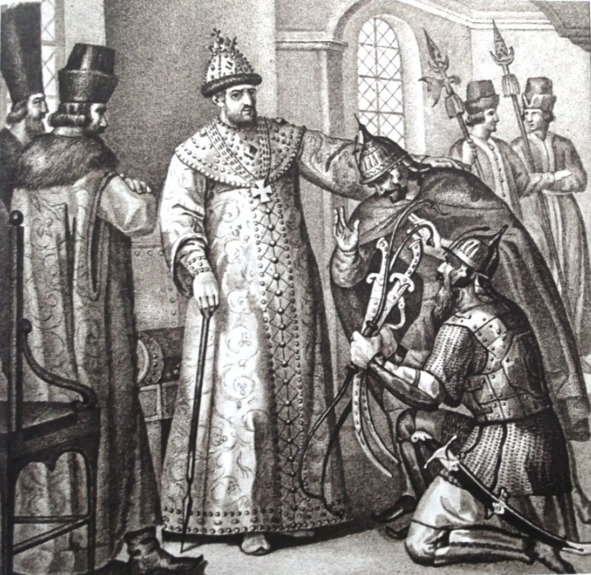 Царю Ивану Грозному вручают военные трофеи, взятые у Девлет Гирея князем Воротынским, 1572 г. Худ. Б. Чориков