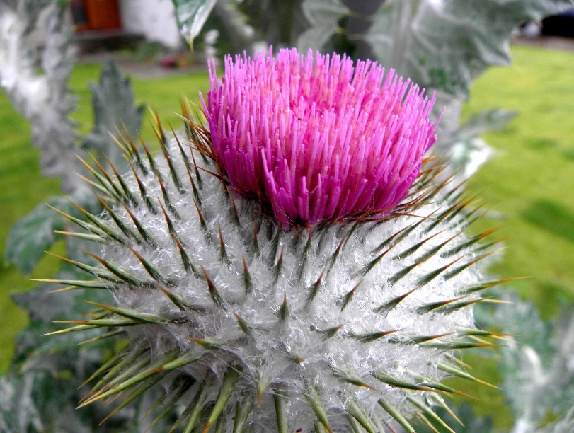 За домом был огород, за ним поле колючего татарника, необычное и красивое фиолетовое растение манило, но было защищено иглами, им можно было только любоваться, не срывая, красивое, но в то же время устрашающее растение.