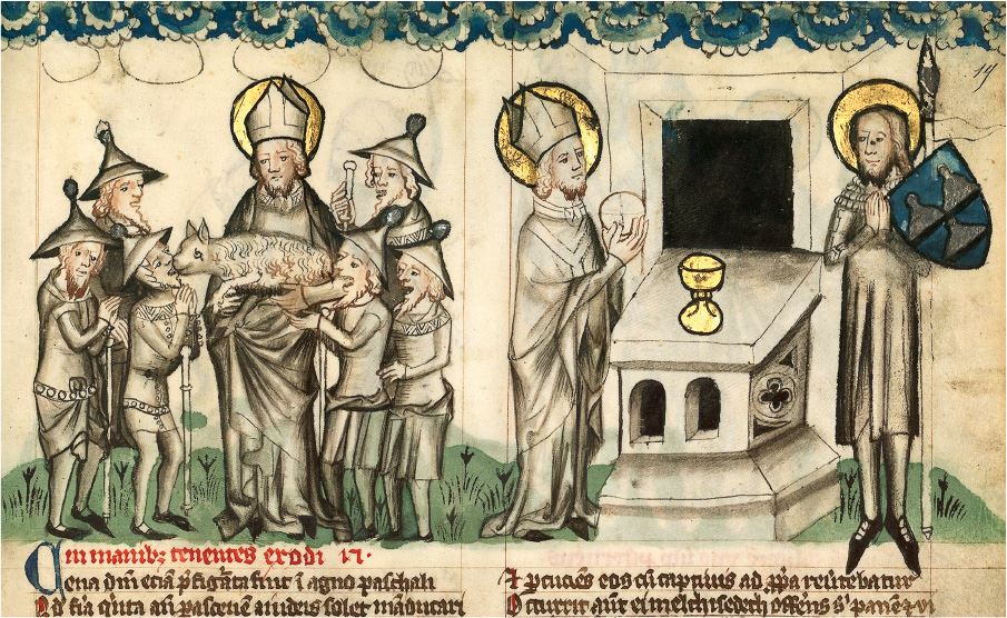 Это прекрасно видно в «Зерцале человеческого спасения», созданном в Эльзасе в 13701380-х гг. На одном из листов изображены две сцены, в которых христиане видели ветхозаветные префигурации евхаристии (I.1.15)[84]. Слева стоит группа иудеев в юденхутах. Разинув рты, они тянут руки к пасхальному агнцу, лежащему на руках у первосвященника. Он намного выше остальных (что подчеркивает его власть и авторитет), одет в митру как у католического епископа, а вокруг его головы сияет золотой нимб. Как сказано в тексте «Зерцала», Господь, выводя евреев из Египта, заповедал им в память об избавлении на Пасху есть агнца так и Христос во время Тайной вечери, чтобы спасти людей из плена Сатаны, установил таинство евхаристии. Как евреи едят агнца с горькими травами, так и христиане должны причащаться плоти Христовой с горечью покаяния[85].