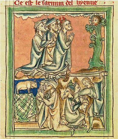 На иллюстрациях в одной из английских рукописей бестиария Ле Клера справа на развороте изображена гиена, пожирающая труп человека, а слева иудеи, которые на нее так похожи (I.1.14). Сверху ветхозаветные пророки в юденхутах во главе с рогатым Моисеем стоят на коленях перед Неопалимой Купиной, в которой им явился ангел Господень или сам Господь (Исх. 3:2-4). Здесь он предстает в облике Христа с крещатым нимбом. А снизу израильтяне, отвернувшись от своего Бога, поклоняются золотому тельцу, стоящему на алтаре. И некоторых из них убивают мечом по приказу Моисея (Исх. 32:27-28)[81]. Праведная молитва обращена направо к Богу (Христу), а неправедная налево, к идолу. Однако и благочестивые израильтяне, и грешники, служащие «кумиру», одеты в одинаковые юденхуты.