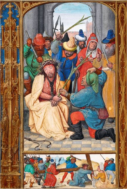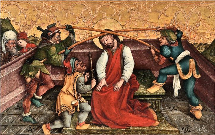 6. Трое воинов, измываясь над Христом, коронуют его терновым венцом. В этом изображении собраны основные приемы, которые на исходе Средневековья применялись для изобличения палачей Богочеловека: у усача в зеленом приспущены штаны, так что мы видим его голые ноги; у его товарища справа к шапке пришит шутовской бубенчик; воин, стоящий перед Христом, показывает ему язык. И у двоих мучителей по кромке одежды нарисована (как подразумевается, вышита) псевдоеврейская надпись.