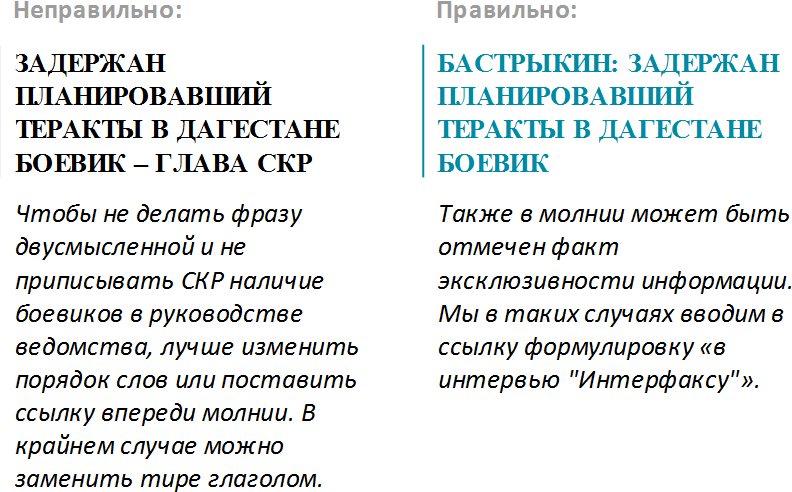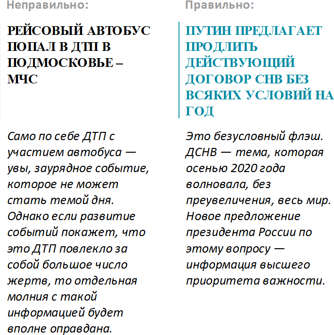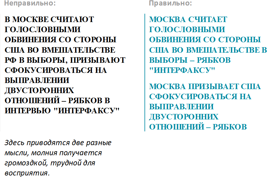 Молния должна донести важнейшую информацию до подписчика быстро, коротко и ясно, но при этом ни в коем случае нельзя искажать смысл. Такой риск всегда существует, поэтому при передаче молний надо быть очень внимательным к формулировкам.