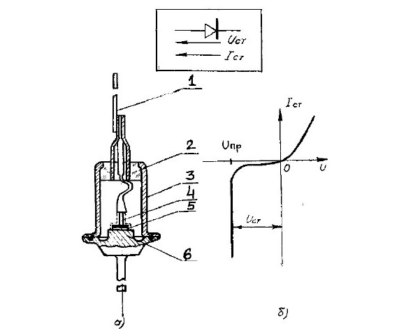 Со2.12 расм. Кремнийли стбилитроннинг конструкцияси (а) ва ВАТи (б); 1,8 ташқи чиқиқ, 2 трубка, 3 изолятор, 4 корпус, 5 ички чиқиқ, 6 кристалл, 7 кристалл тутқич.