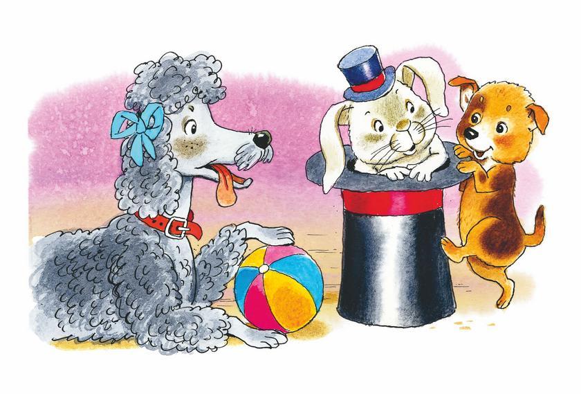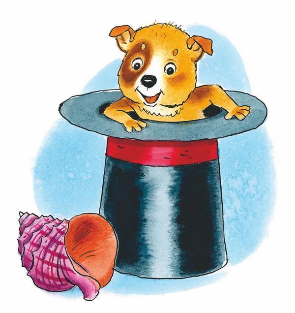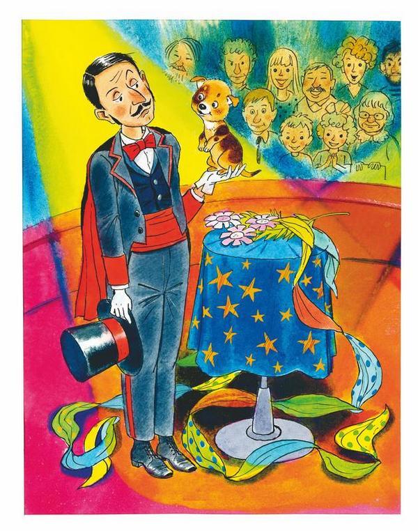 Все закричали: «Браво!» и захлопали в ладоши, когда из цилиндра вместо кролика высунулся нос щенка. Фокусник поднял щенка, улыбаясь и раскланиваясь.