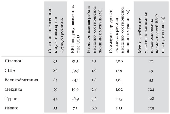 Источники: трудоустройство и положение в рейтинге экономического участия и возможностей Всемирный экономический форум, Отчет о глобальном гендерном разрыве, 2017 г.; ВВП на душу населения CIA, World Factbook, 2017 г.; распределение времени база данных Организации экономического сотрудничества и развития, доступ 2 ноября 2018 г.