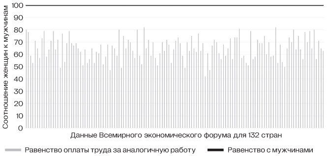 Несмотря на ключевую роль женщин в нашем материальном благополучии, женскую экономику стабильно недооценивают. Повсеместно бытует убеждение, что женщинам просто меньше положено. Это проявляется, например, в равенстве платы за аналогичную работу[15]. Всемирный экономический форум организация, которая каждый год собирает данные на эту тему, провела «обзор мнения руководителей» опрос менеджеров в ста тридцати двух странах. Респондентов спрашивали: «В какой степени в вашей стране женщинам платят столько же, сколько мужчинам, за ту же работу»? Сумма ответов не прямое указание на фактические зарплаты, а оценка принятой в данной стране практики: сколько женщинам платят традиционно и, как подразумевается, справедливо. На рис. 2 вы можете убедиться, что в мире нет страны, где обоим полам принято было бы платить за ту же работу одинаково. Считается, что женщины чем бы они ни занимались заслуживают получить около шестидесяти пяти процентов того, что дают мужчинам. Этот предрассудок ставит женщин в подчиненное положение во всех сферах экономики.
