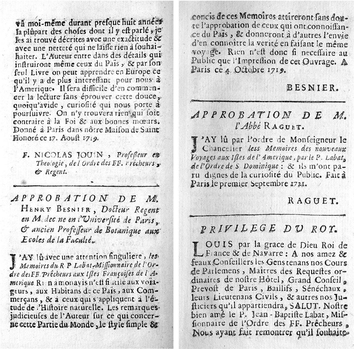 Рис. 2. Текст одобрения и привилегии, напечатанный перед сочинением Nouveau voyage aux isles de lAmérique. Некоторые замечания в тексте привилегии (здесь приведена только первая часть) указывают на юридические действия, осуществленные ради ее коммерческого использования: 1. Книга включена в официальный реестр Парижской гильдии издателей и книготорговцев. 2. Автор, Ф. Ж.-Б. Лаба, официально отказался от привилегии, которую ему предоставили, в пользу двух книготорговцев: Жиффара и Кавелье-сына. (Как сказано выше, только книготорговцы и издатели имели право продавать книги.) 3. Жиффар и Кавелье-сын подтвердили, что разделили права, предоставляемые привилегией, между четырьмя участниками: каждый оставил себе одну четвертую долю участия в привилегии, а две другие они передали Кавелье-отцу и Теодору Легра, тоже книготорговцам