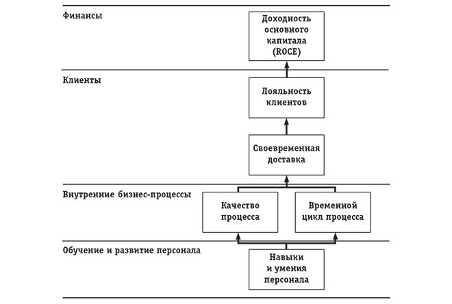 Далее. Какие внутренние процессы необходимо улучшить, чтобы достичь высочайшего уровня OTD? Для этого, возможно, потребуется сокращение временных циклов в операционных процессах и высокое качество внутренних процессов, причем оба фактора могут быть показателями составляющей внутренних бизнес-процессов. Каким же образом компания выполнит эти требования? Обучая и совершенствуя навыки и умения работников, то есть ставя цель, которая может быть зафиксирована в составляющей обучения и развития персонала. Мы видим, как вся цепочка причинно-следственных связей в виде вертикального вектора отражена во всех четырех составляющих ССП: