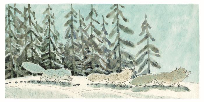 Песцы долго бежали по дороге.